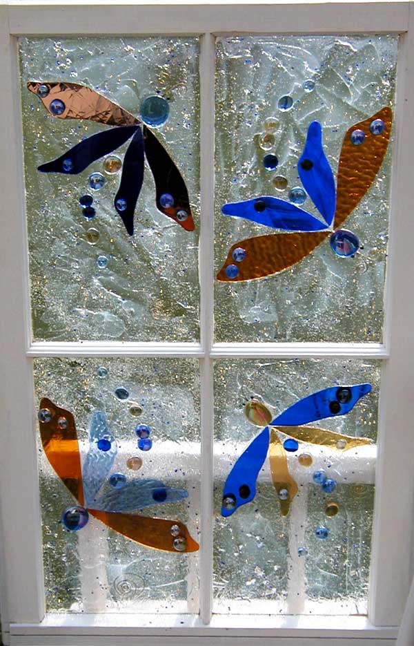 Lynn: “Well, technically it’s mixed media…more specifically, mosaic-style style indoor/outdoor stained glass on recycled window frames…..but, mostly I’d describe it as fun and colorful!”